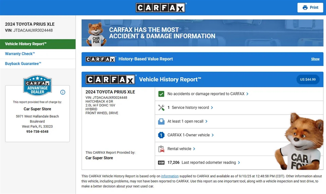 This sleek and modern 2024 Toyota Prius XLE is the ideal hybrid for comfort, technology, and fuel economy. With just 37,000 miles and a clean CARFAX, it is a high-value, low-mileage vehicle that?s ready to drive. It comes well-equipped with a variety of safety and tech features that make it one of the most sought-after hybrids on the market.